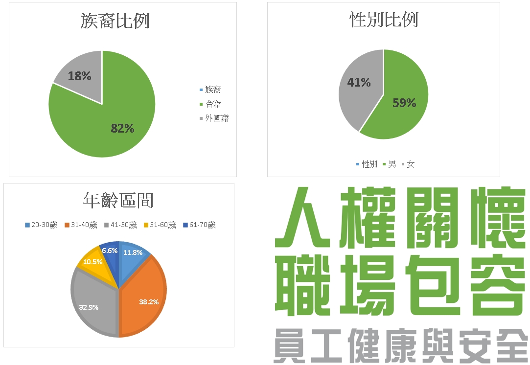 | 我們重視每一位員工,致力於提供多元包容、友善職場,落實僱用多樣性、薪酬與升遷機會的公平性,確保員工不因性別、族裔、性別、性傾向、宗教信仰、年齡、 政治傾向及其他受適用法規保護的任何其他狀況而遭歧視、騷擾或不平等待遇。 本公司為提供受僱者、派遣勞工及求職者免於性騷擾之工作及服務環境,並採取適當之預防、糾正、懲戒及處理措施,以維護當事人權益及隱私,特依性別平等工作法第十三條第一項,以及勞動部頒布「工作場所性騷擾防治措施準則」之相關規定,訂定「工作場所性騷擾防治措施申訴及懲戒辦法」。另在職之原住民員工,我們亦尊重其文化習俗,從未有發生違反工作權及人權之相關情事。 |