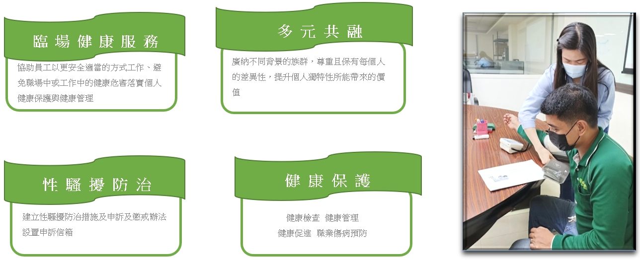| 我們相信員工的健康是企業永續的關鍵指標,每年藉由員工健康檢查、臨場健康服務、職業傷病預防、評估工作負荷量是否造成員工過勞(異常工作負荷促發疾病預防計畫)、懷孕員工健康保護(母性健康保護計畫)、職場暴力預防(執行職務遭受不法侵害預防計畫)、肌肉骨骼疾病預防(人因性危害預防計畫)。 |